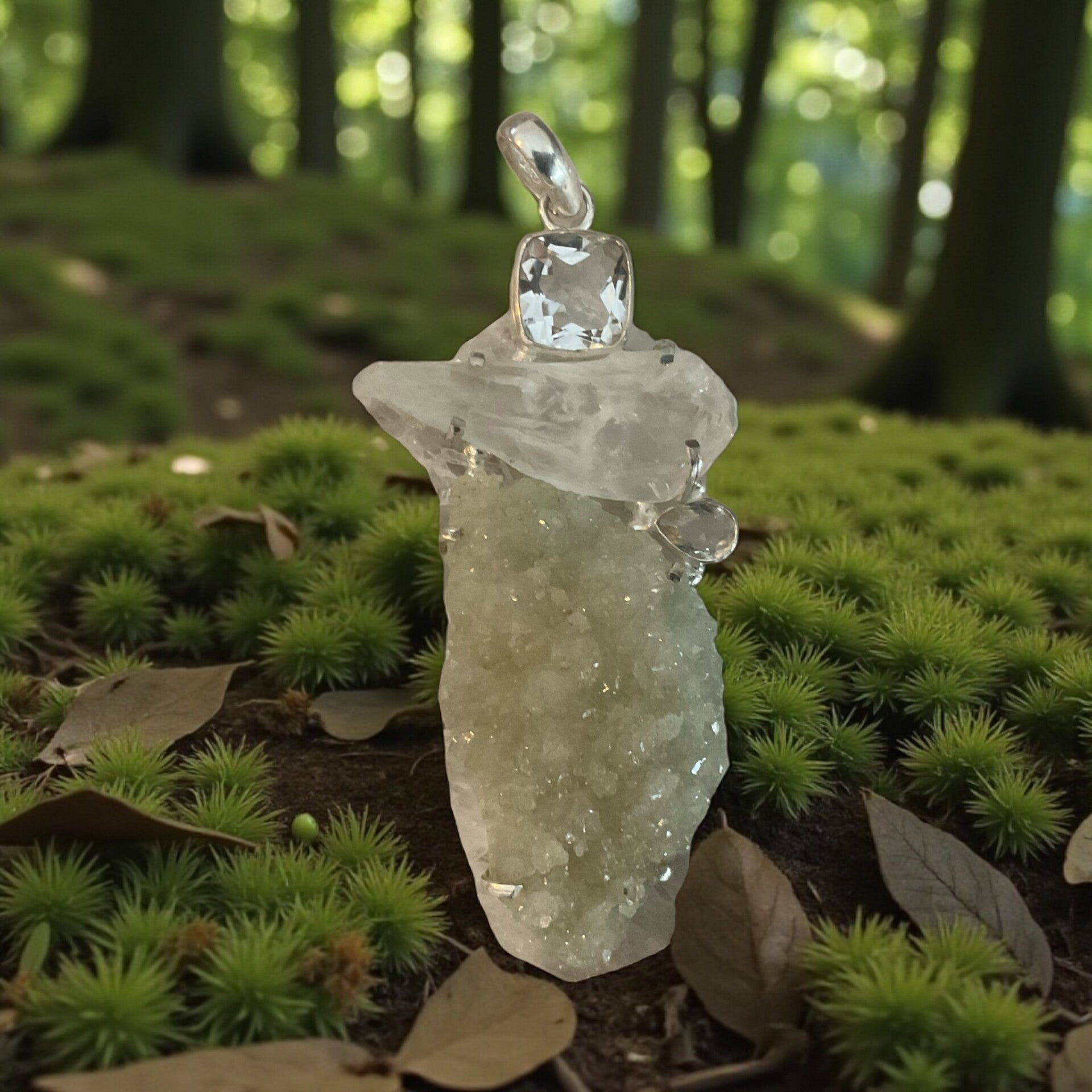 .925 SS Prehnite Pendant with Faceted & Rough Quartz and White Topaz Gemstones